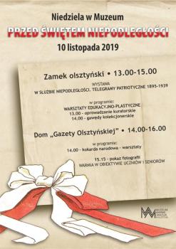 10 listopada w godzinach 13.00 – 15.00 na Niedzielę w Muzeum i finisaż wystawy: „W służbie niepodległości. Telegramy patriotyczne 1895-1939”. Wydarzenie zostało przygotowane w związku ze Świętem Niepodległości 11 listopada oraz zbliżającym się terminem zamknięcia wystawy przygotowanej na rocznicę stulecia odzyskania przez Polskę niepodległości.