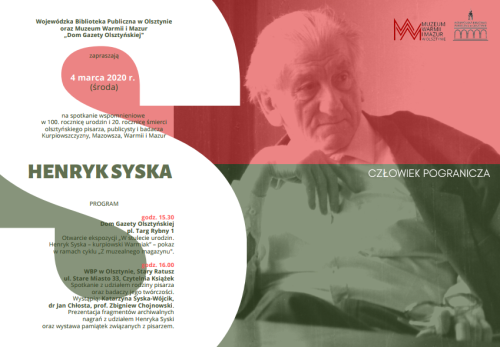 Wojewódzka Biblioteka Publiczna w Olsztynie zaprasza w środę, 4 marca o godz. 17.00 na spotkanie wspomnieniowe "Henryk Syska – człowiek pogranicza" zorganizowane w 100. rocznicę urodzin i 20. śmierci olsztyńskiego pisarza, publicysty i badacza Kurpiowszczyzny, Mazowsza, Warmii i Mazur.