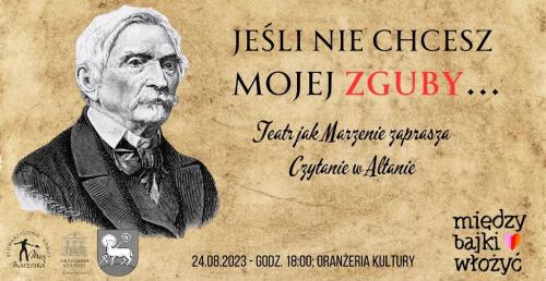 Oranżeria Kultury w Lidzbarku Warmińskim zaprasza 24.08.2023 w czwartek o godz. 18:00 na Czytanie w Altanie "Jeśli nie chcesz mojej zguby ... " w wykonaniu "Teatru jak Marzenie" oraz zaproszonych gości. Zaproszenie od samego hrabiego Aleksandra Fredry? Jemu odmówić nie uchodzi...!