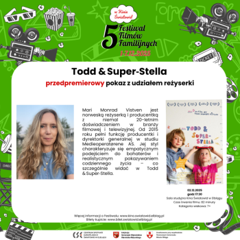 W ramach 5. Festiwalu Filmów Familijnych 2025, Centrum Spotkań Europejskich "Światowid" w Elblągu zaprasza na pokaz norweskiego filmu dokumentalnego Todd i Super‑Stella (2024) z udziałem reżyserki Mari Monrad Vistven. Film zostanie pokazany w sekcji Najlepsze z najlepszych, a po seansie będzie okazja do rozmowy z twórczynią.
