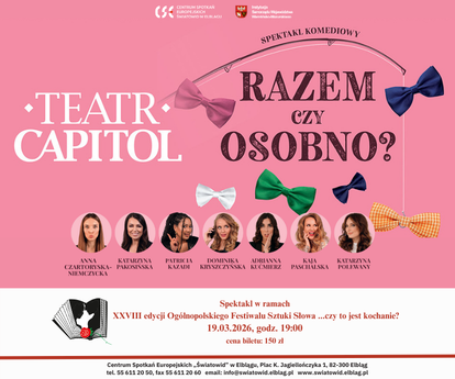 Czy da się kochać „na zawsze”? A może czasem lepiej… osobno? Na te pytania spróbują odpowiedzieć twórcy muzyczno-komediowego spektaklu „Razem czy osobno?”, który już 19 marca zostanie zaprezentowany w Centrum Spotkań Europejskich „Światowid” w Elblągu. To pełne humoru, muzyki i emocji widowisko zaprasza widzów do świata relacji damsko-męskich – z przymrużeniem oka, ale i ze sporą dawką refleksji.