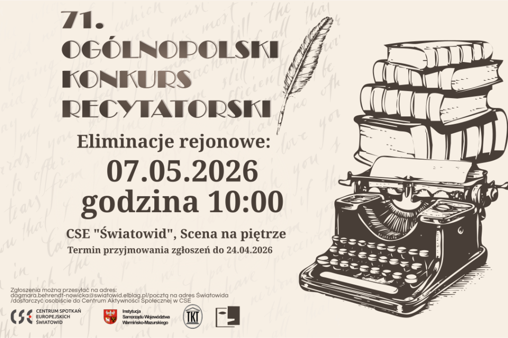 7 maja 2026 roku o godz. 10:00 na Scenie na Piętrze w Centrum Spotkań Europejskich „Światowid” w Elblągu odbędą się eliminacje rejonowe 71. Ogólnopolskiego Konkursu Recytatorskiego. To wydarzenie od lat przyciąga tych, dla których literatura nie jest tylko tekstem na papierze, ale przestrzenią osobistej wypowiedzi.