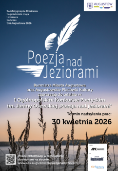 Burmistrz Miasta Augustowa oraz Augustowskie Placówki Kultury zapraszają do udziału w I Ogólnopolskim Konkursie Poetyckim im. Janiny Osewskiej „Poezja nad jeziorami”.
